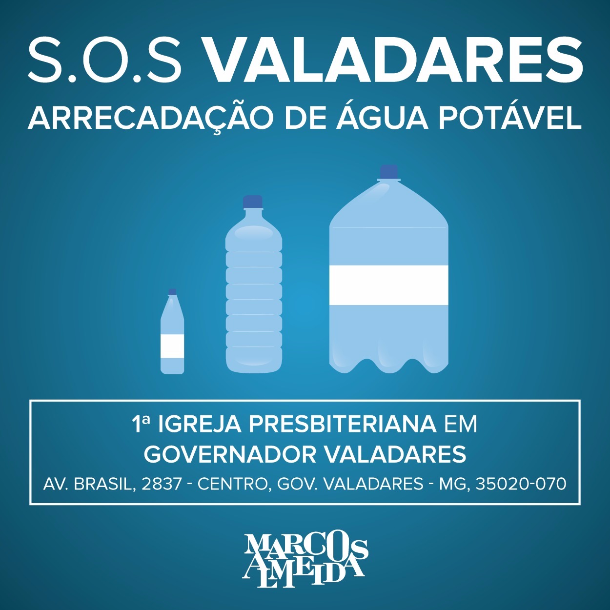 Quem optar por contribuir com doação de água para Gov. Valadares segue endereço,  Primeira Igreja Presbiteriana de Governador Valadares: Av. Brasil, 2837 - Centro. Telefone da Igreja: 33-32716868 e do Pb Jaeder:  33-99908.9052. Favor agendar entrega.